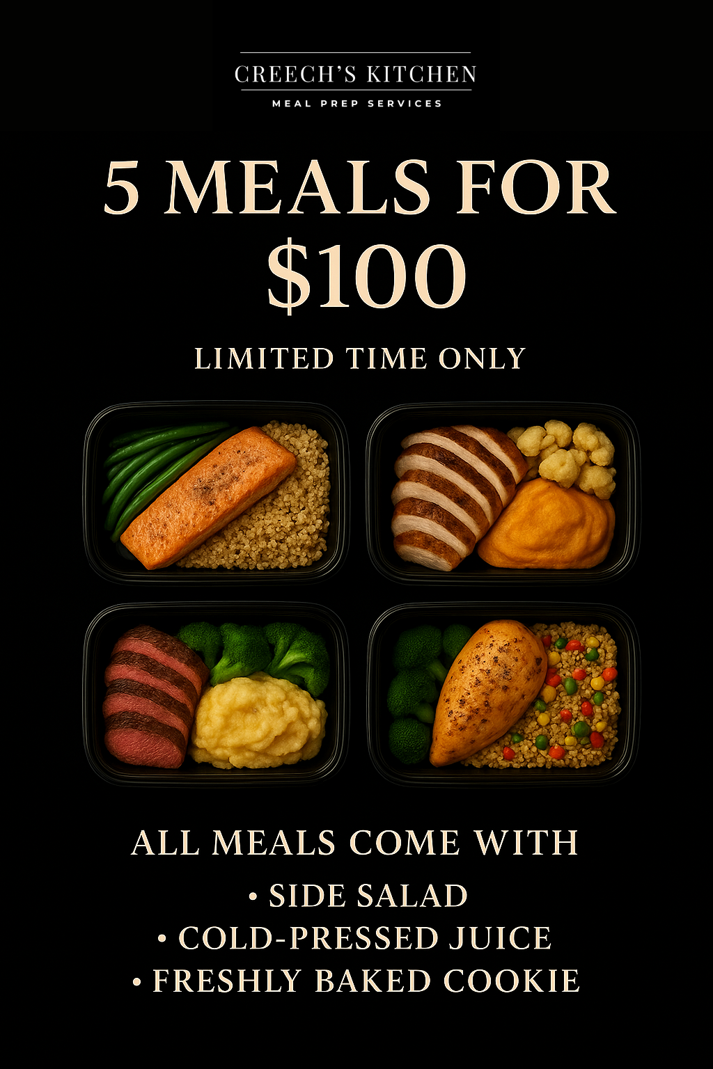 Stop spending $10–$20 every day on greasy, tasteless fast food. Creech’s Kitchen delivers chef-prepared, hearty meals that keep you full, energized, and ready for whatever your day throws at you.
